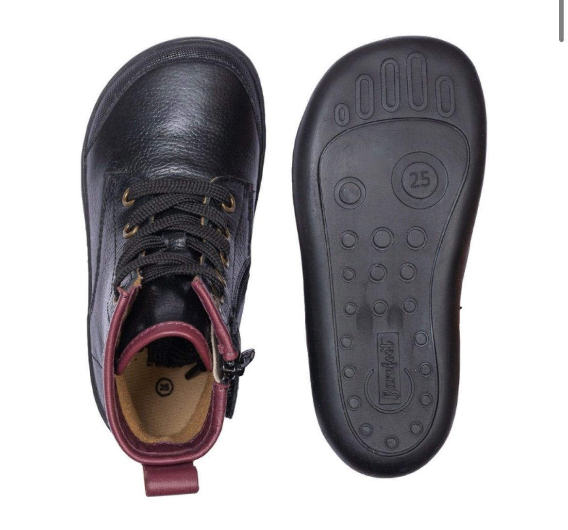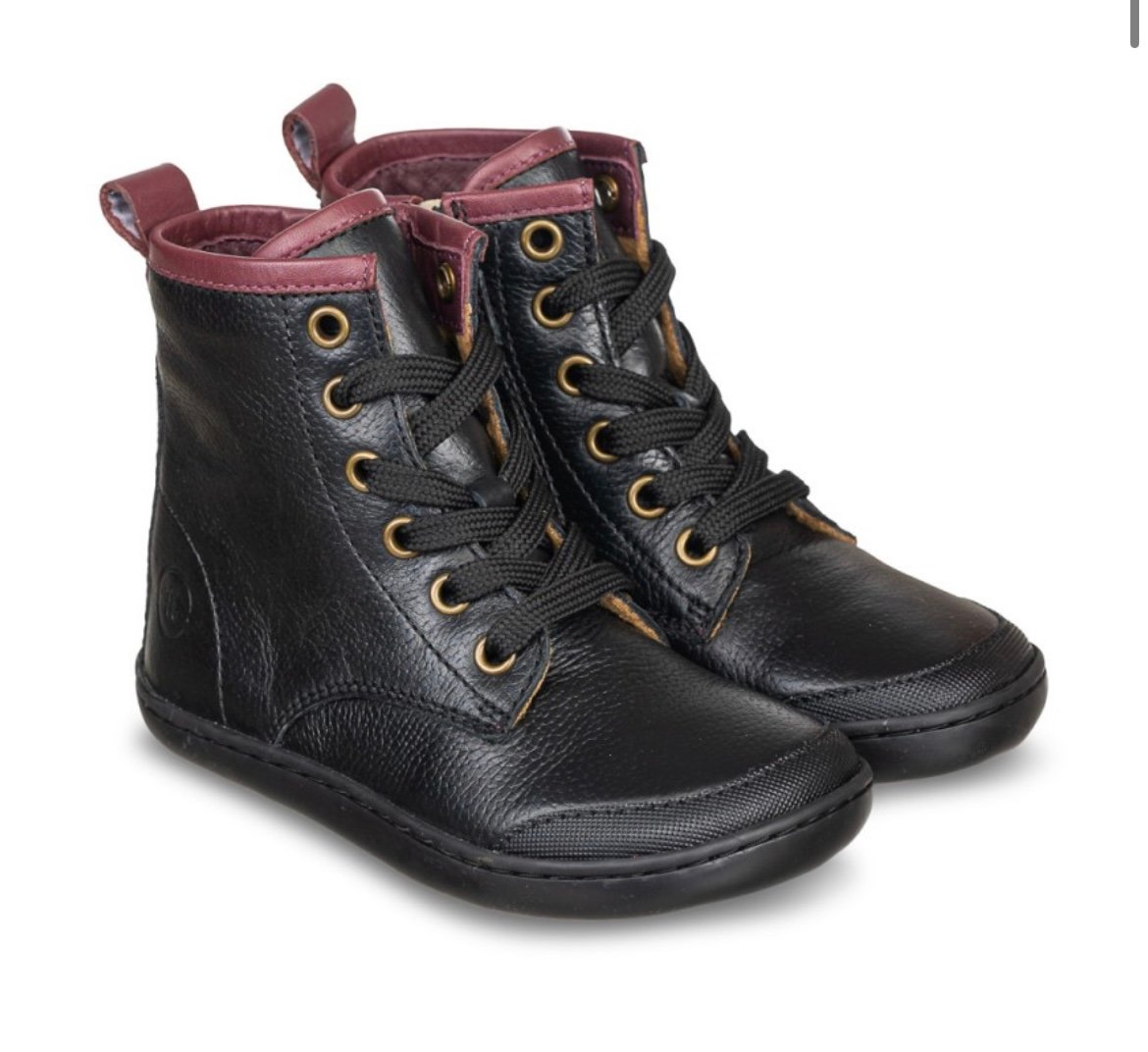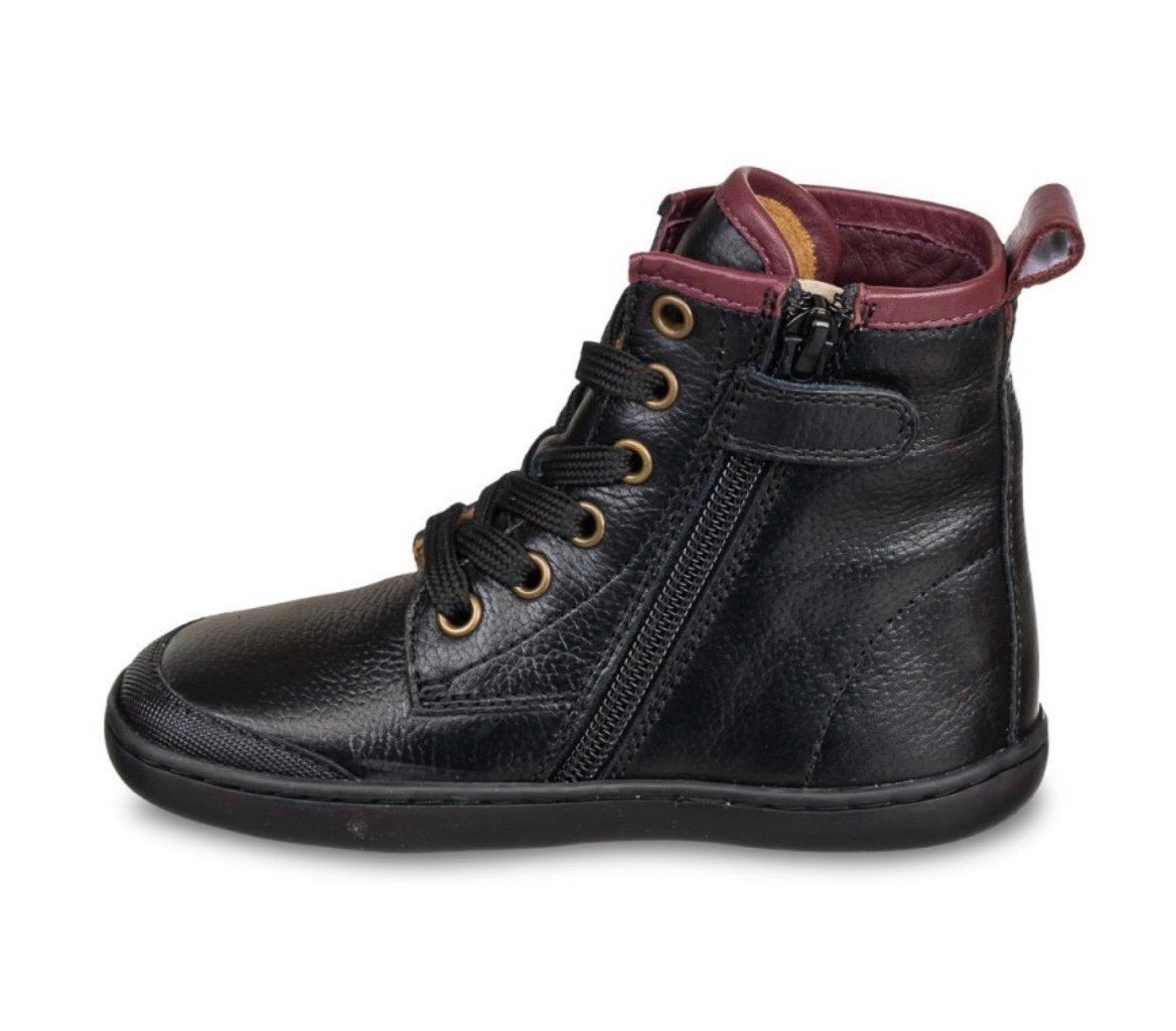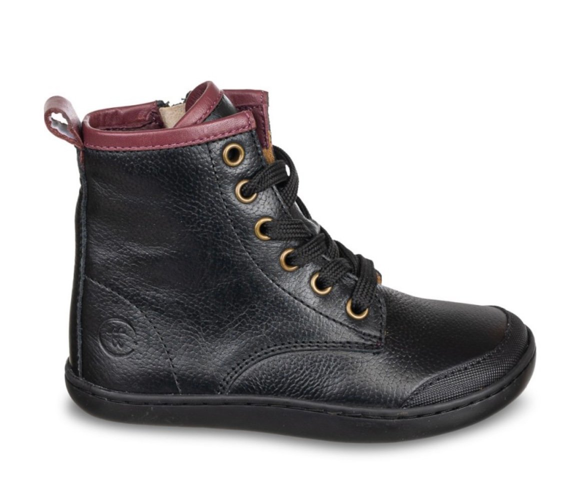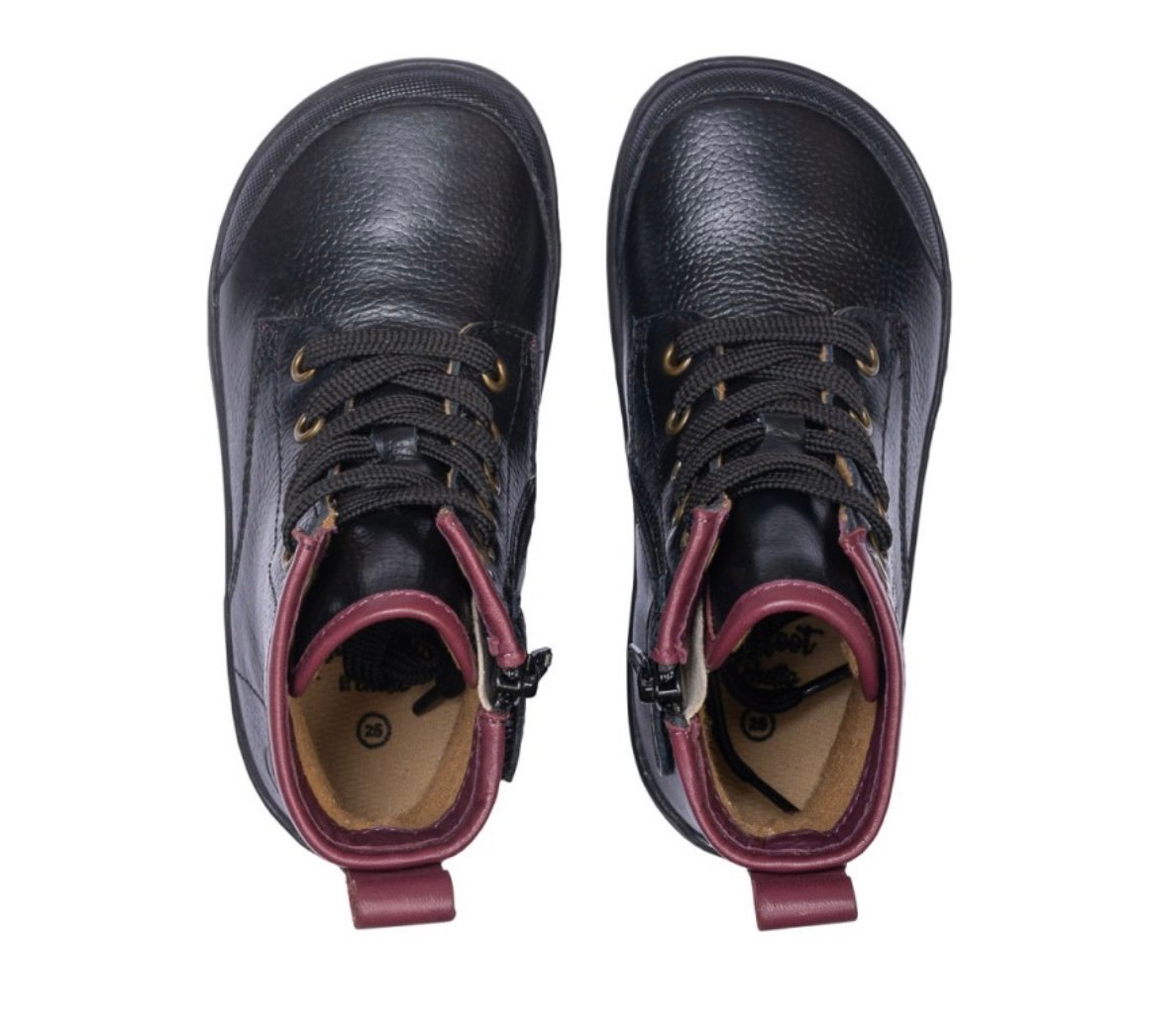 Fabricadas en 100% piel natural, estas botas proporcionan una sensación suave y flexible. La suela de goma flexible tipo barefoot permite una pisada libre y respetuosa, crucial para el desarrollo natural del pie. El interior está forrado con un textil cálido y suave, ideal para mantener el confort durante los meses fríos. El diseño incluye cordones frontales para un ajuste preciso, junto con una cremallera lateral que facilita el calce diario, haciendo que sean fáciles de poner y quitar incluso para los niños más pequeños. Un tirador de tobillo en color burdeos en la parte trasera, que hace juego con el collar acolchado, aporta un contraste elegante y distintivo.
