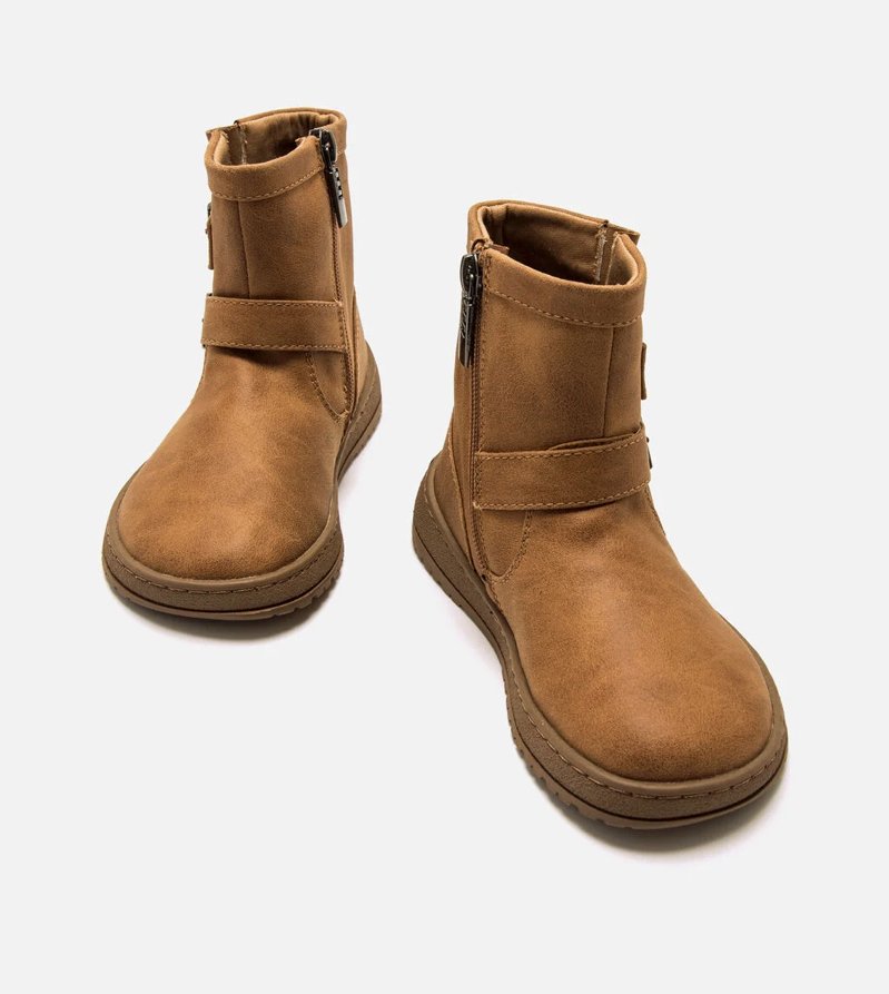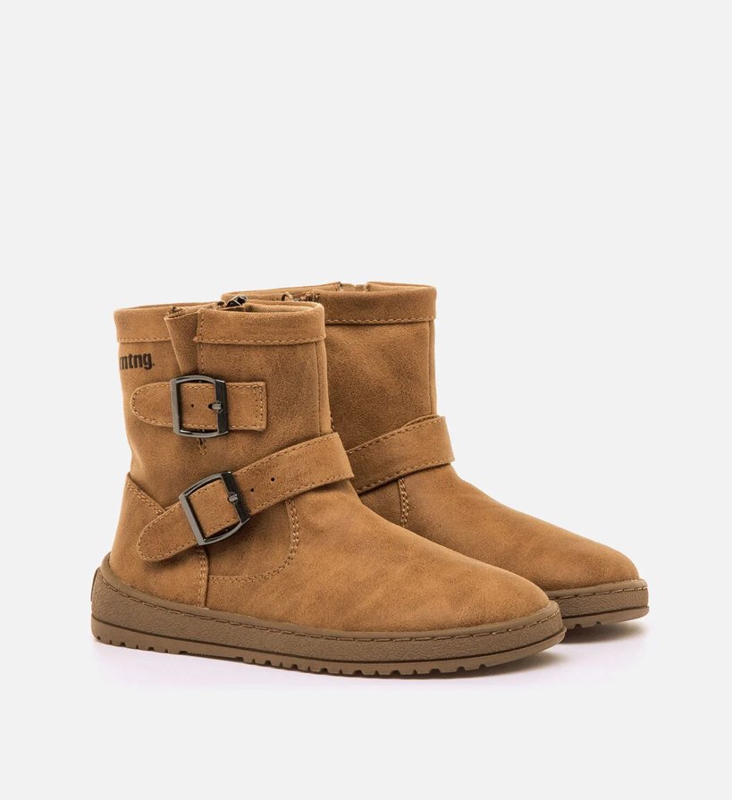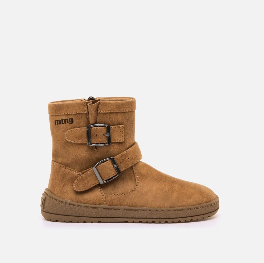 Los botines planos de color marrón para peques de la marca Mustang, modelo Free, combinan diseño urbano y practicidad. Con su acabado efecto nobuk, logran un look moderno y versátil que se adapta a diversas ocasiones. Las dos hebillas metálicas laterales aportan un toque biker, mientras que la cremallera interior garantiza un uso sencillo, ideal para la rutina diaria.