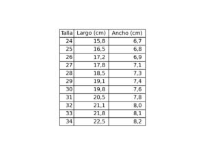 Disponibles en tallas de la 25 a la 34, recomendamos medir el pie y dejar un margen de 0,8–1 cm para elegir la talla perfecta y garantizar el ajuste ideal.